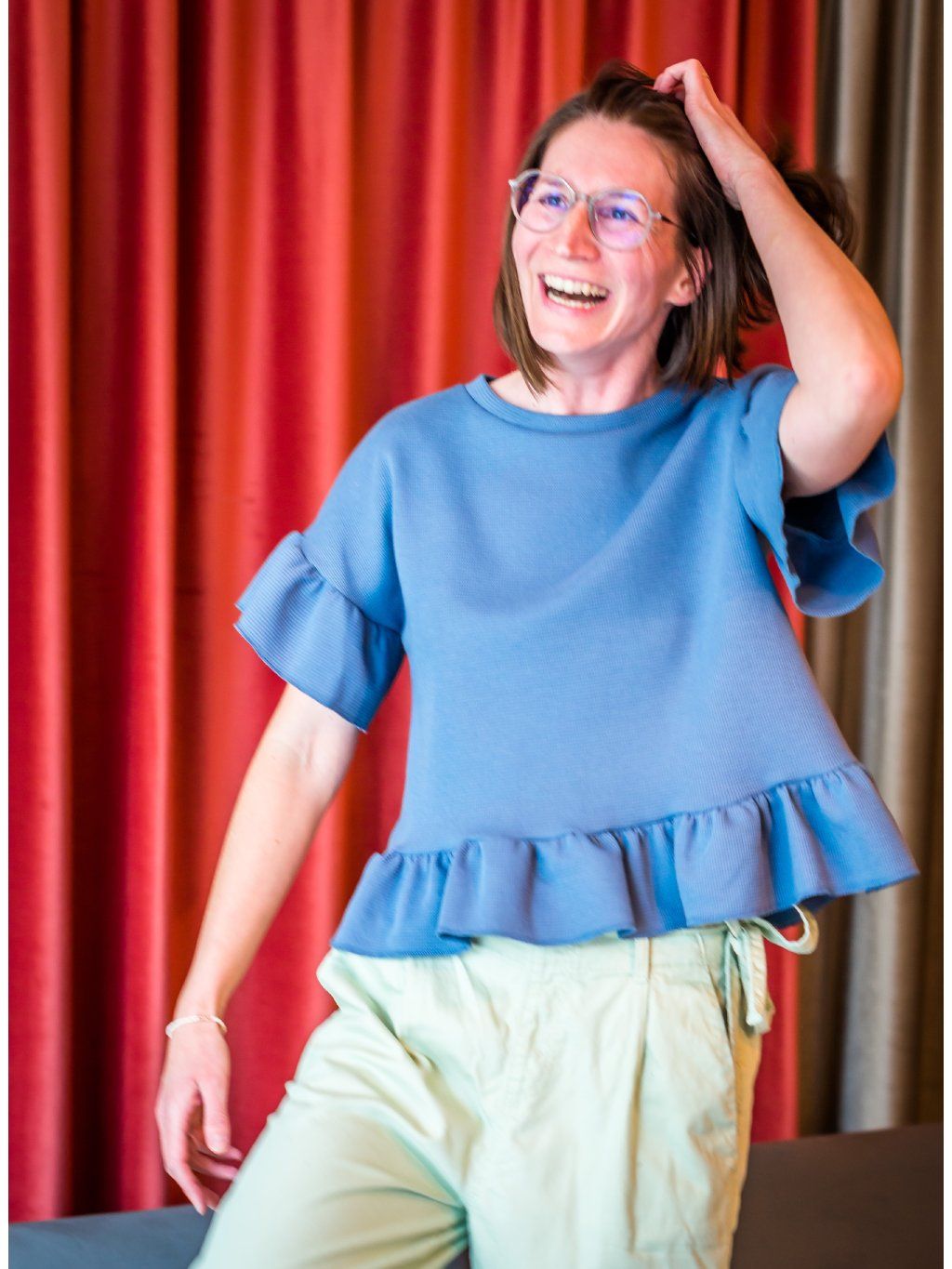 Volánové tričko z vaflového úpletu. Kousek, který vzešel z radosti nadcházejícího jara. Po dlouhé zimě jsem měla potřebu ušít něco, kde si můžeme dovolit volnost, rozevlátost..zastrkávání spodních vrstev do kalhot už bylo dost, jaro volá!