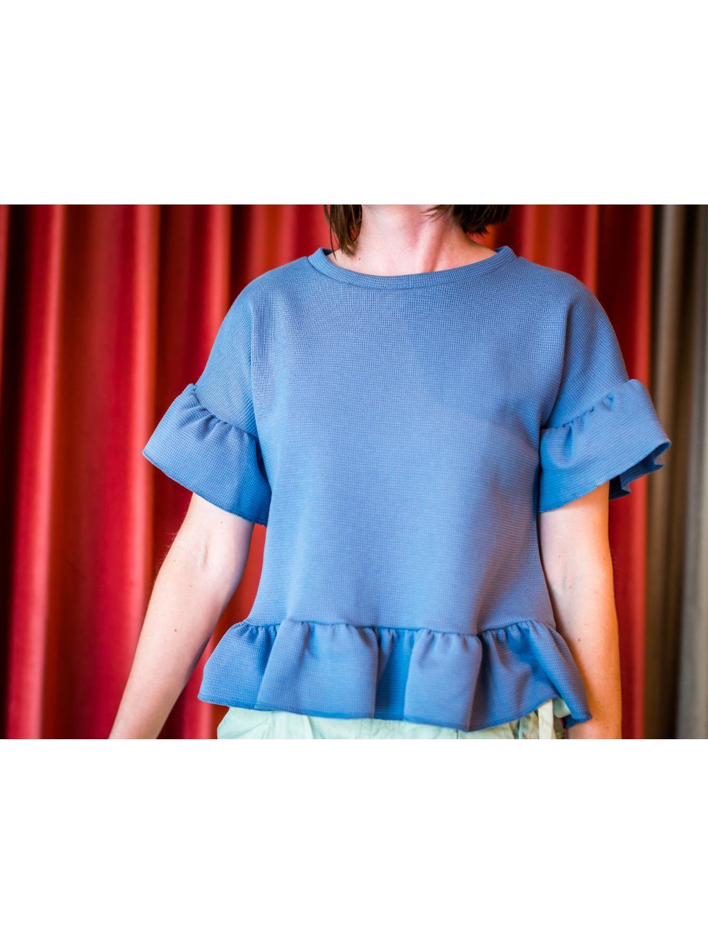 Tričko je ušito ze silnějšího vaflového úpletu, vynosíte od podzimu do jara. Pokud se vám volánové triko líbí, ale nesedla vám barva, napište mi a domluvíme se. V nabídce je více barev, s radostí ušiji kousek přímo pro vás.